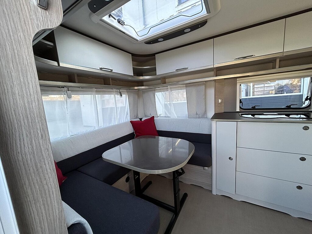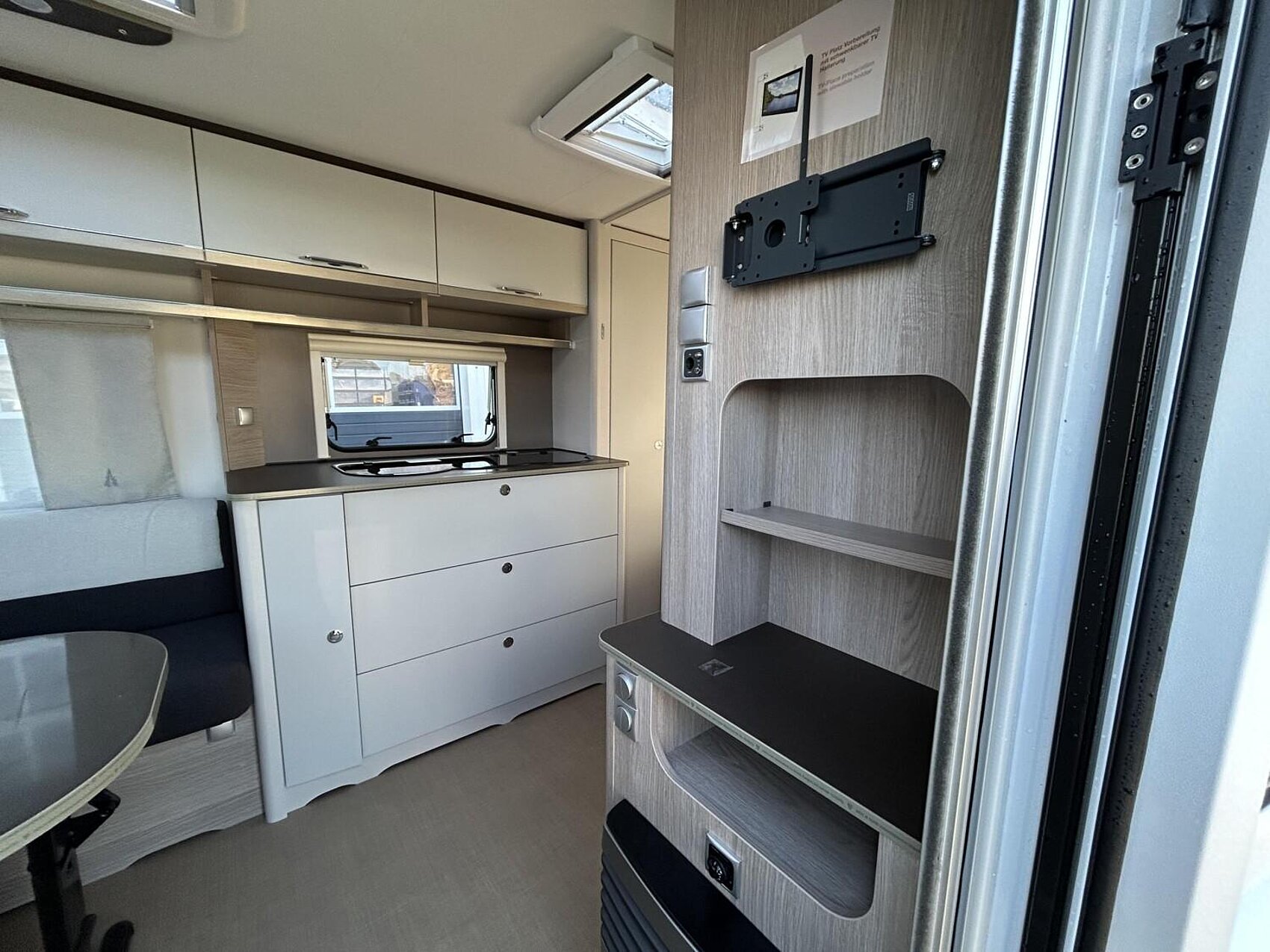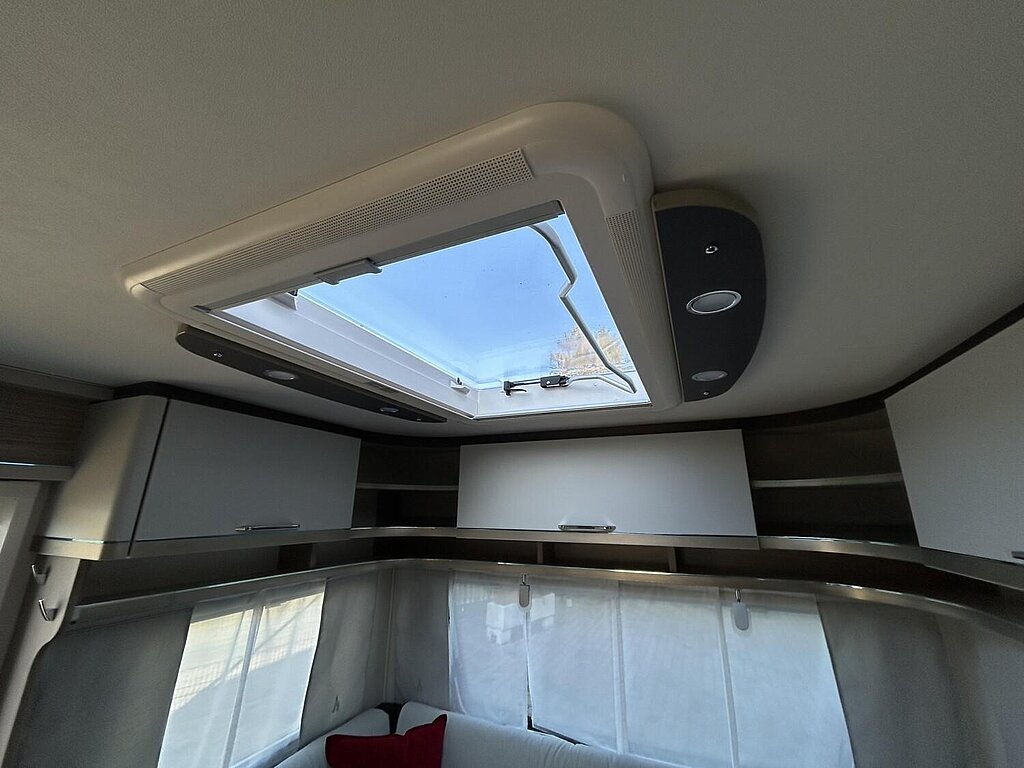 - Premio Paket 2 (Umluftanlage 230 V, Dachfenster 96 x 65 cm anstelle Dachhaube 40 x 40 cm, Fliegenschutz für Eingangstür, Elektrischer Warmwasseraufbereiter mit 5 l Wasserinhalt, 300 W, Indirekte Beleuchtung Oberschränke, Aufbautür einteilig mit Fenster und Abfallsammler)