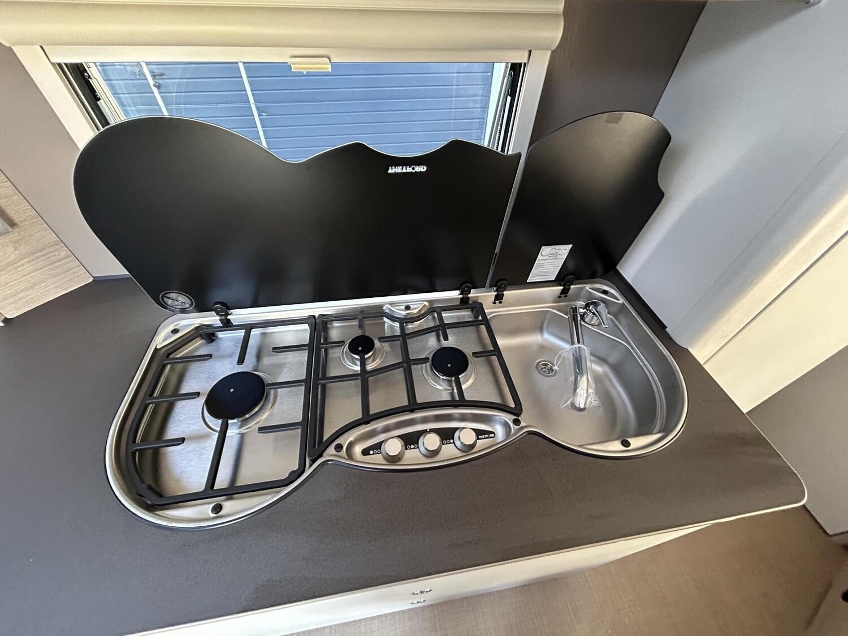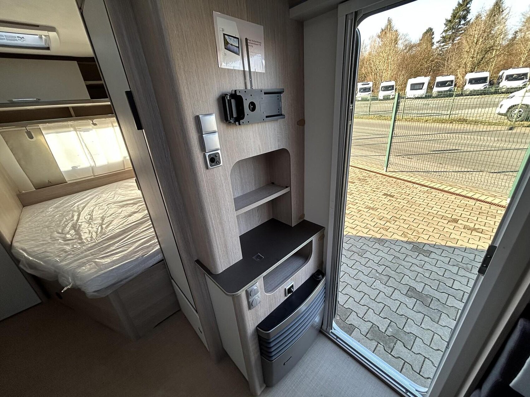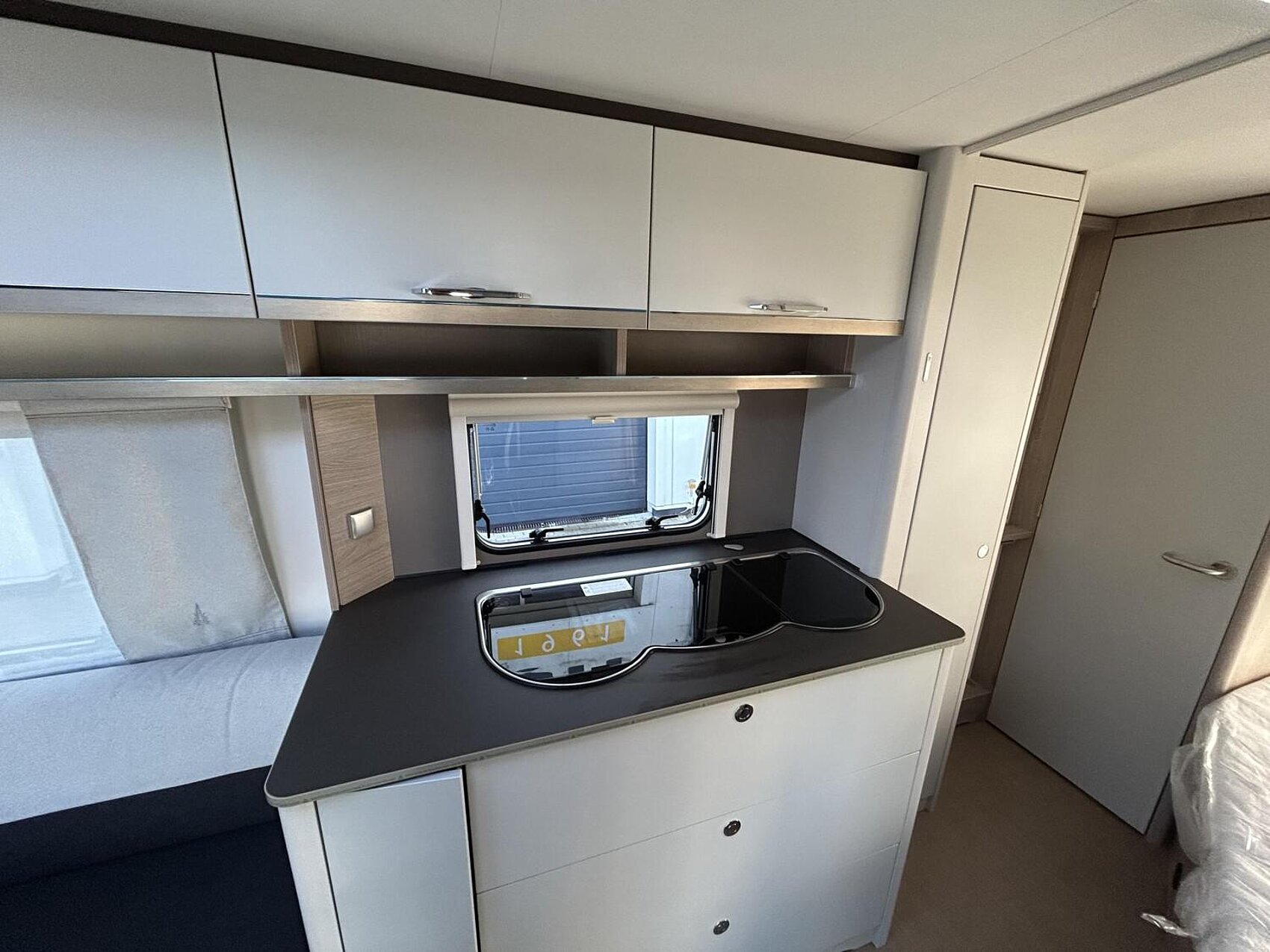- Premio Paket 2 (Umluftanlage 230 V, Dachfenster 96 x 65 cm anstelle Dachhaube 40 x 40 cm, Fliegenschutz für Eingangstür, Elektrischer Warmwasseraufbereiter mit 5 l Wasserinhalt, 300 W, Indirekte Beleuchtung Oberschränke, Aufbautür einteilig mit Fenster und Abfallsammler)