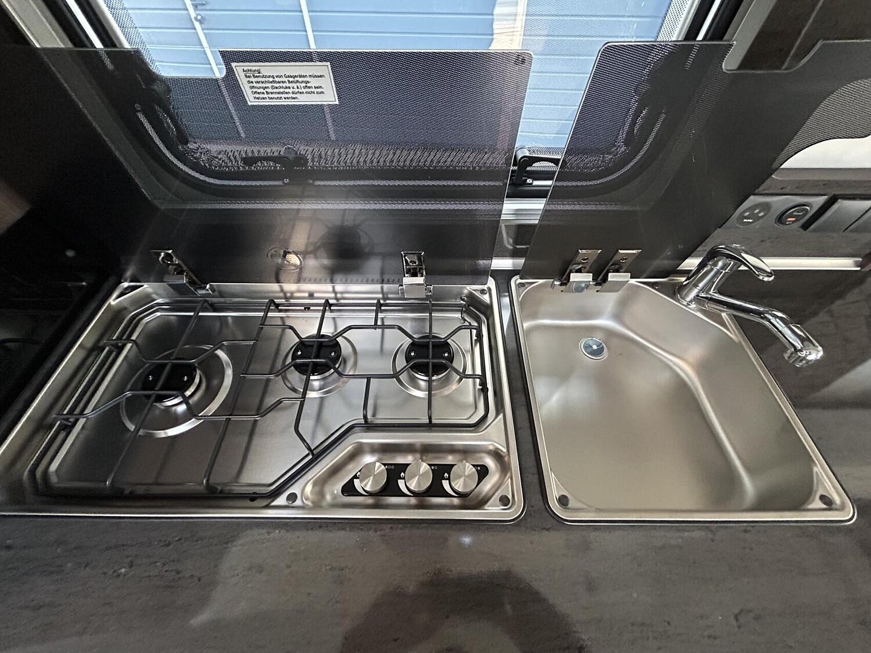 - Kocher und Spüle aus Edelstahl, mit 3-Flammkocher, elektrischer Zündung und zweiteiliger Glasabdeckung